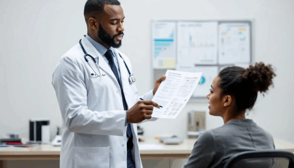 . W obrazie lekarz wyjaśnia pacjentowi skutki uboczne leku Concerta 18 mg, podkreślając znaczenie odpowiedniego dawkowania i monitorowania objawów, takich jak nasilenie wcześniejszych zaburzeń psychicznych. Scena ilustruje profesjonalną interakcję, w której lekarz dostarcza istotnych informacji na temat stosowania leku w kontekście ADHD.